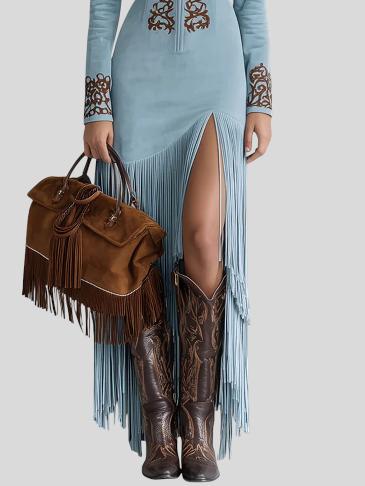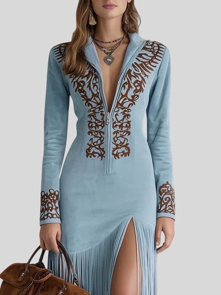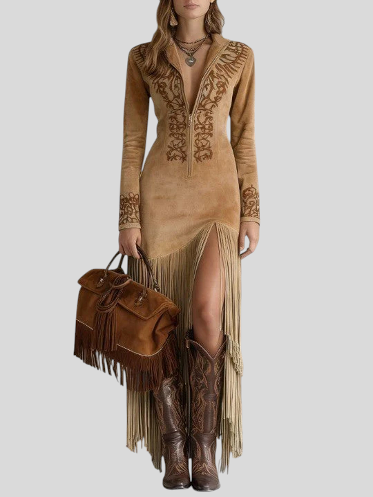 Brigita - Izvezena Maxi Haljina Od Umjetne Brušene Kože S Polovičnim Patentom