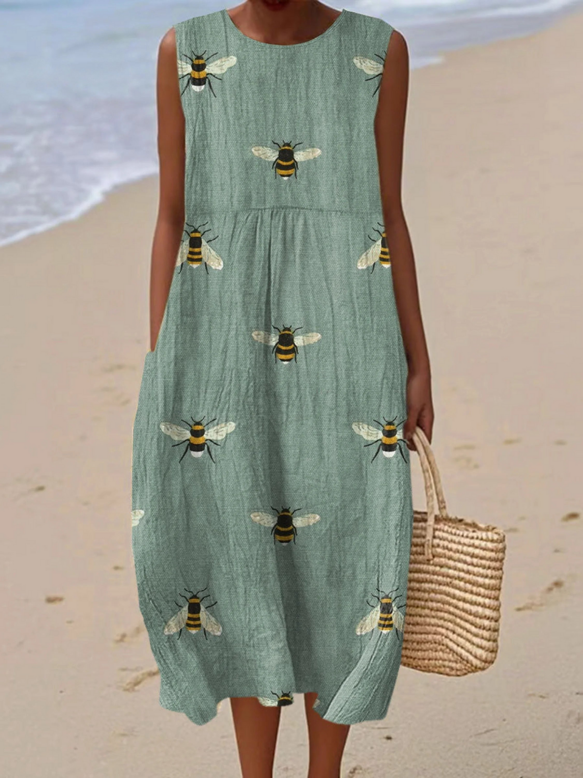 Ženska vintage umjetnička print haljina bez rukava s džepovima