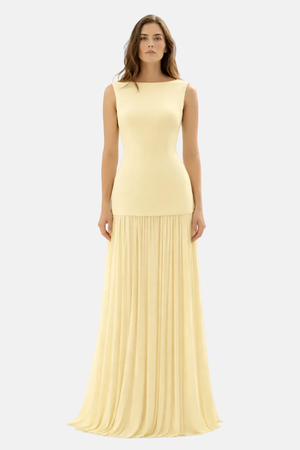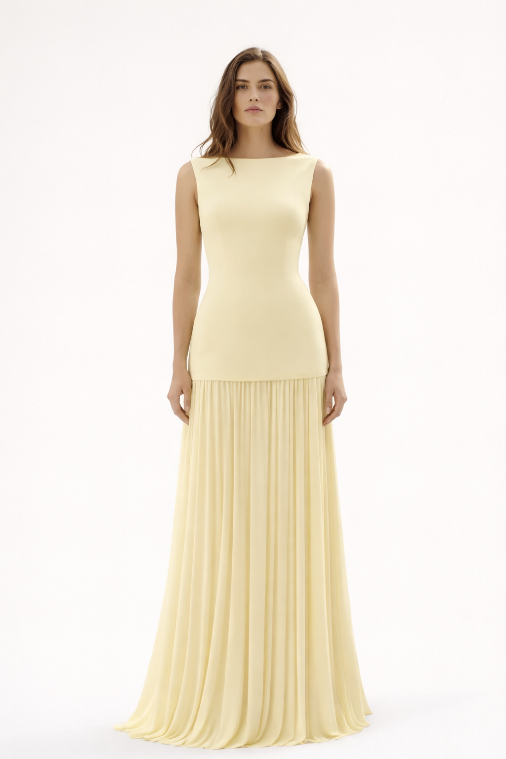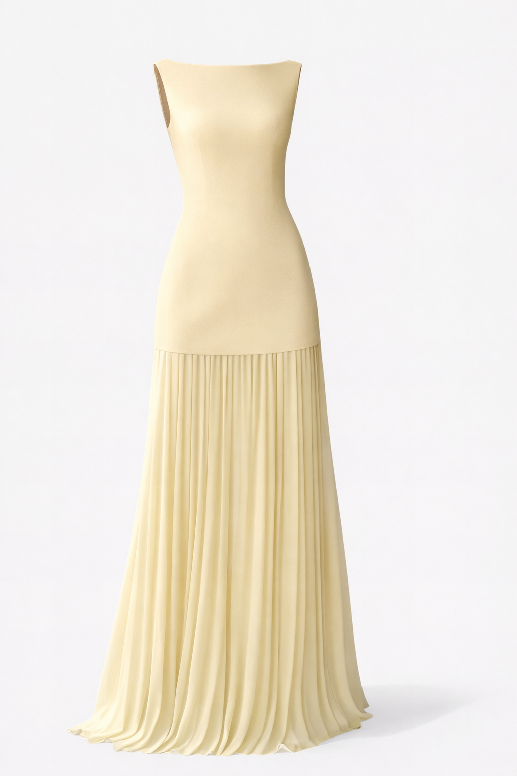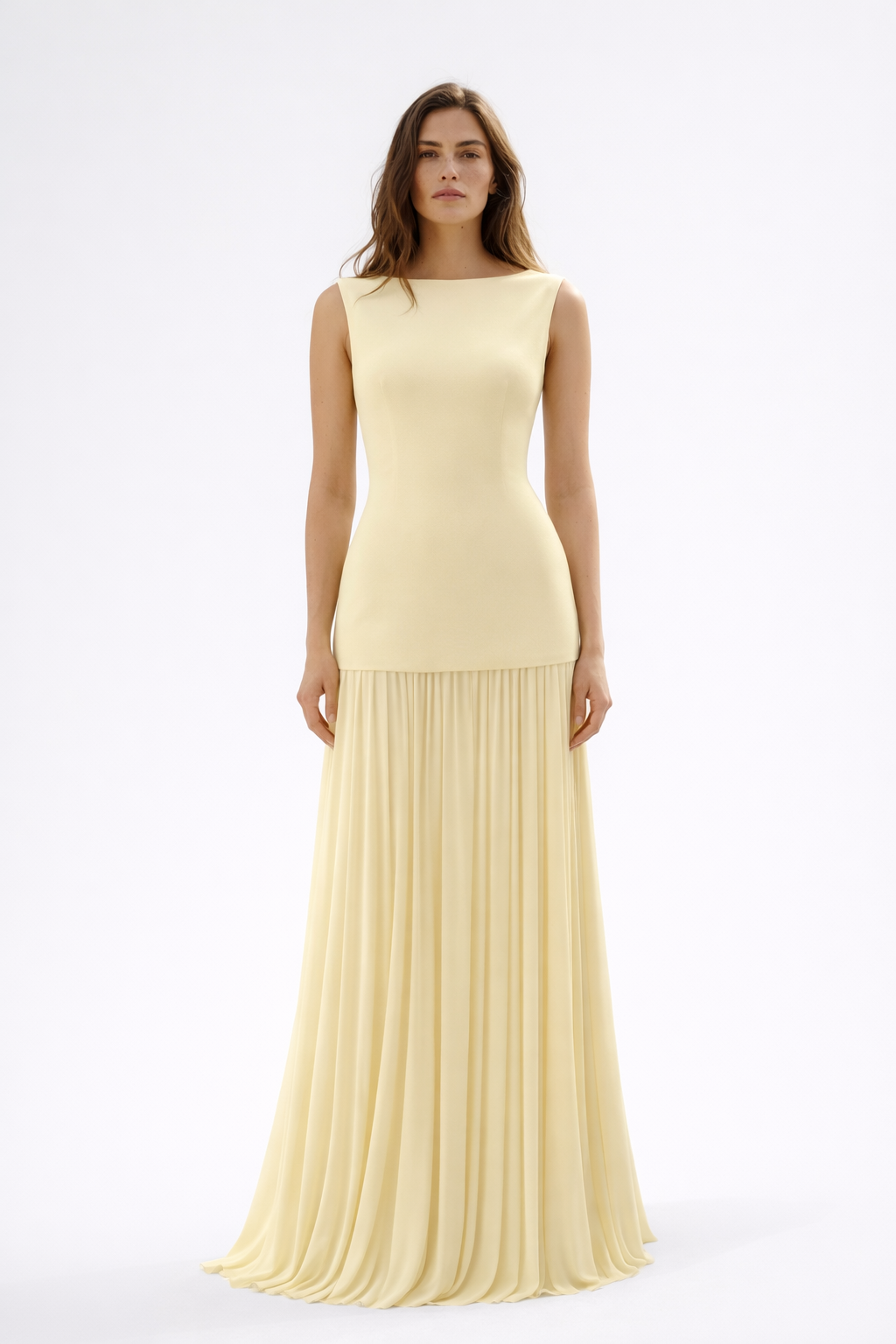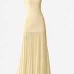 Ova luksuzna haljina spaja sofisticiran dizajn s besprijekornom siluetom koja naglašava ženstvenost i gracioznost. Gornji dio profinjeno prati liniju tijela, dok donji dio s raskošnim naborima stvara dojam lakoće i fluidnog pokreta. Idealna je za gala događaje, svečane večere ili posebne prilike kada želite zasjati bez kompromisa.