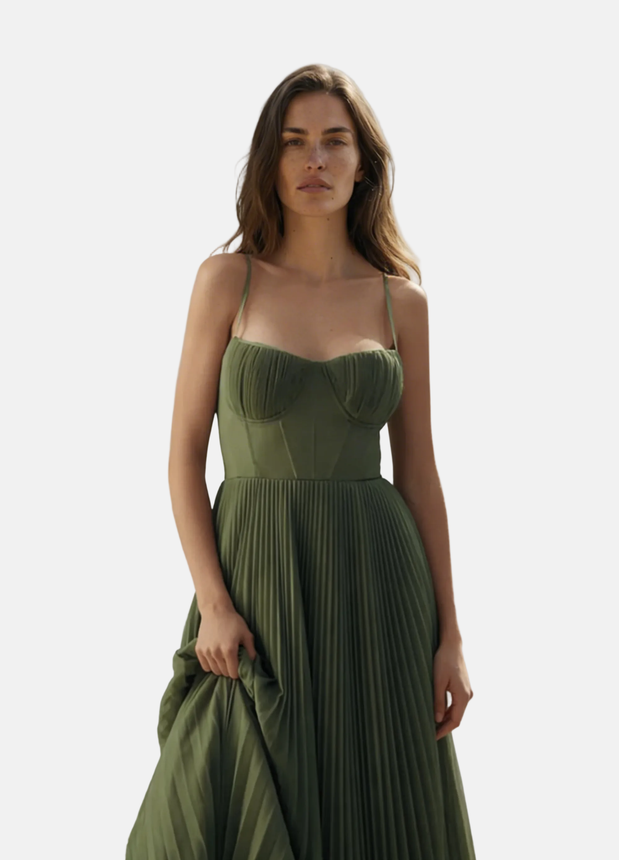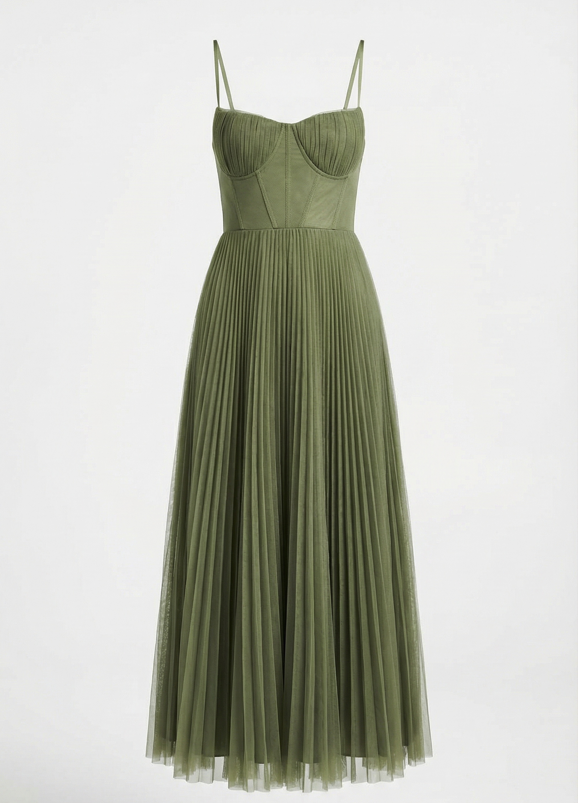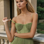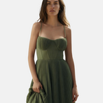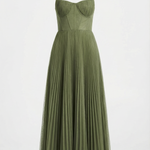 Ova midi haljina spaja sofisticiranost i lakoću u komadu koji naglašava svaki detalj ženske siluete. Strukturirani korzet nježno ističe dekolte, dok plisirana, lepršava suknja donosi pokret i šarm. Idealna za posebne prigode, osigurava elegantan i nezaboravan izgled bez gubitka udobnosti.