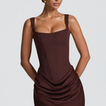 Ova haljina dizajnirana je kako bi naglasila ženstvenost na elegantan i profinjen način. Hourglass kroj oblikuje struk i ističe figuru, dok drapirani donji dio daje dodatnu dinamiku i dozu luksuza. Strukturirana tkanina savršeno prati liniju tijela, stvarajući upečatljiv izgled za posebne događaje ili večernje izlaske. Idealna za žene koje vole zablistati s stilom.