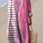 Apstrakna haljina Grace je upečatljiv komad koji se odlikuje inovativnom kombinacijom boja i uzoraka. Nježne ružičaste nijanse lijepo kontrastiraju s hrabrim prugastim dizajnom, stvarajući vizualni tok koji je istovremeno privlačan i elegantan. Opušteni, lepršavi silueta osigurava udobnost, dok V-izrez dodaje dašak ženstvenosti. Savršena za ležerne izlaske i opuštene večeri.