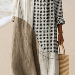 Haljina Ruby s prugama kombinira elegantan, suvremen dizajn s laskavom siluetom. Asimetrični dijelovi u boji bež, bijele i crne stvaraju hrabar vizualni efekt, dok opušteni kroj osigurava udobnost i lakoću. Mekana tkanina lijepo pada, pružajući graciozan tok koji dodaje eleganciju haljini. Idealna za ležerne dane ili dotjerane izlaske.