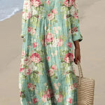 Haljina Vera Blossom je prekrasno ženstveni komad, s mekim, lepršavim materijalom ukrašenim delikatnim cvjetnim uzorcima u blagim, pastelnim nijansama. V-izrez i opušteni kroj naglašavaju figuru dok pružaju udobnost i lakoću, savršeno za tople dane. Dugi rukavi i lagani materijal omogućuju prozračnost dok dodaju dašak sofisticiranosti neformalnom, boho-inspiriranom dizajnu.