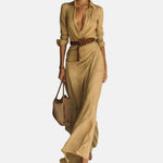 Ova maxi haljina s dugim rukavima spaja sofisticiranost i senzualnost u savršenoj ravnoteži. S elegantnim krojem, naglašenim strukom i lepršavim padom tkanine, naglašava žensku siluetu na bezvremenski način. Višenamjenski komad koji se savršeno uklapa u svečane prigode, ali i u opuštene trenutke, uvijek pružajući upečatljiv i stilski izgled.
