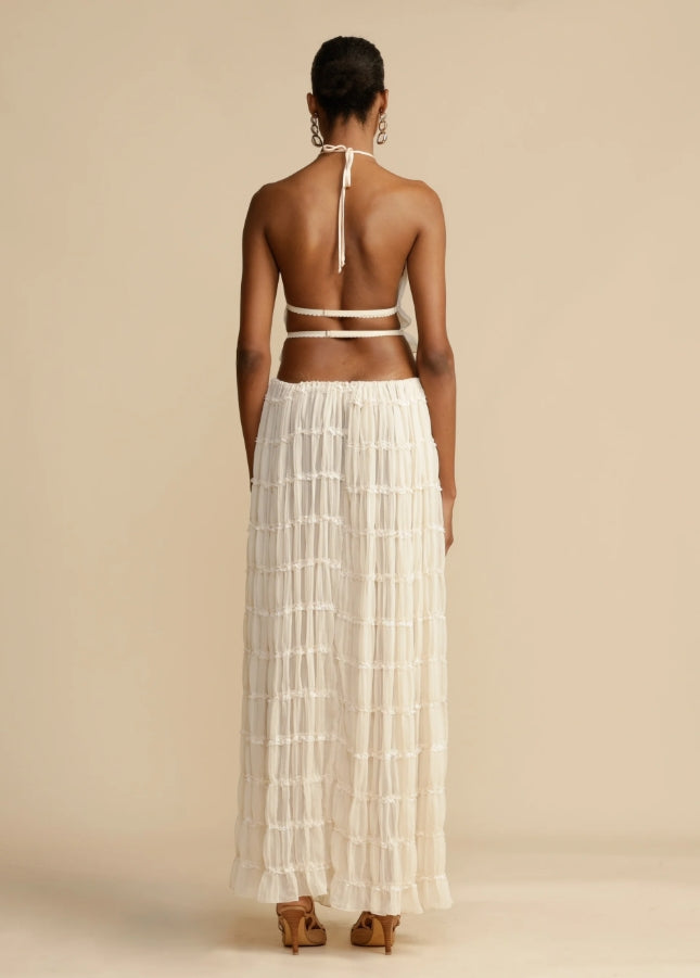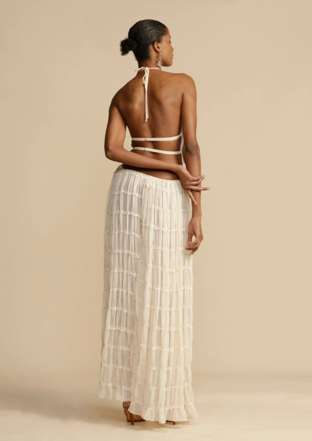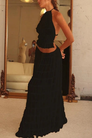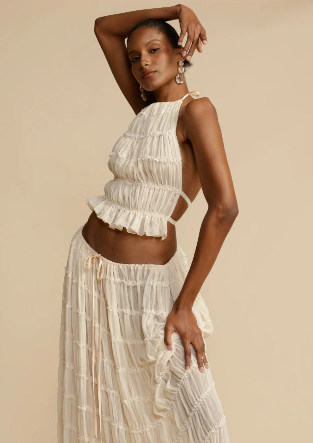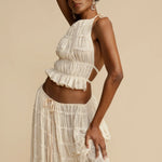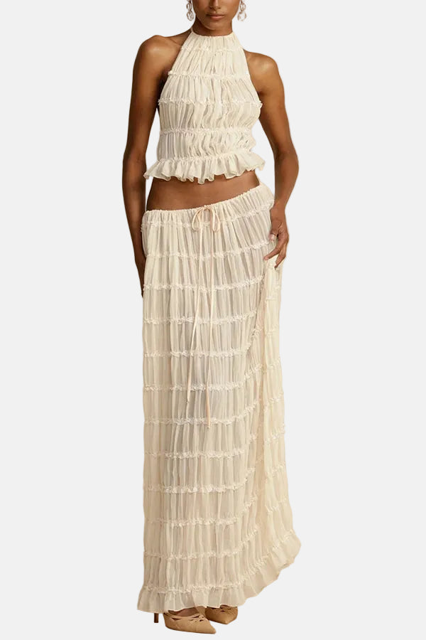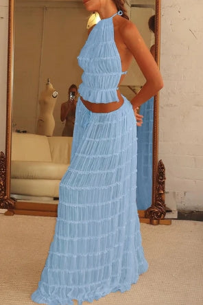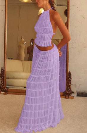 Ovaj jedinstveni i profinjeni komplet savršen je izbor za one koji žele lagan i elegantan izgled. Izrađen od nježnog i lepršavog materijala, komplet je idealan za ljetne događaje, vjenčanja ili bilo koju posebnu prigodu na kojoj se želite istaknuti stilom i udobnošću.
